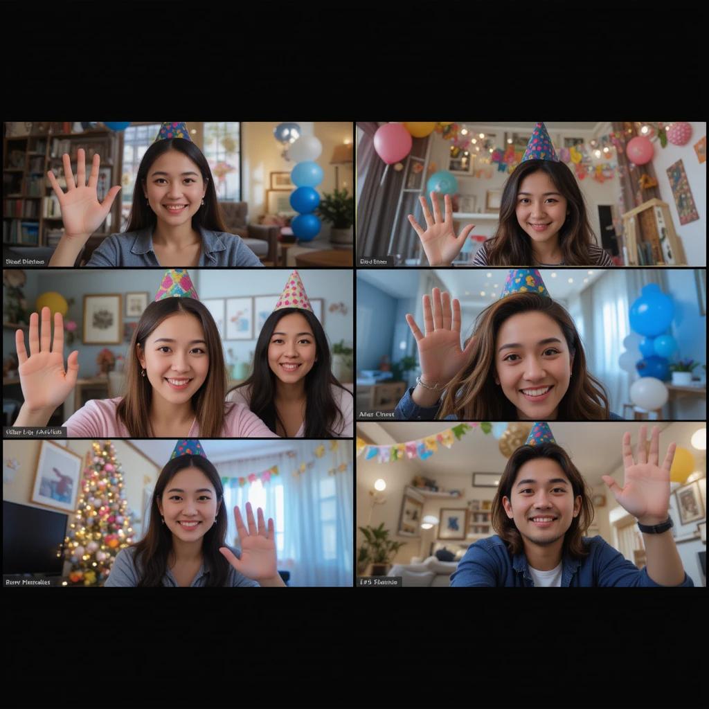 Группа друзей разных возрастов улыбается и машет в веб-камеру, участвуя в виртуальной вечеринке. На экранах видны праздничные декорации, шарики, колпачки.