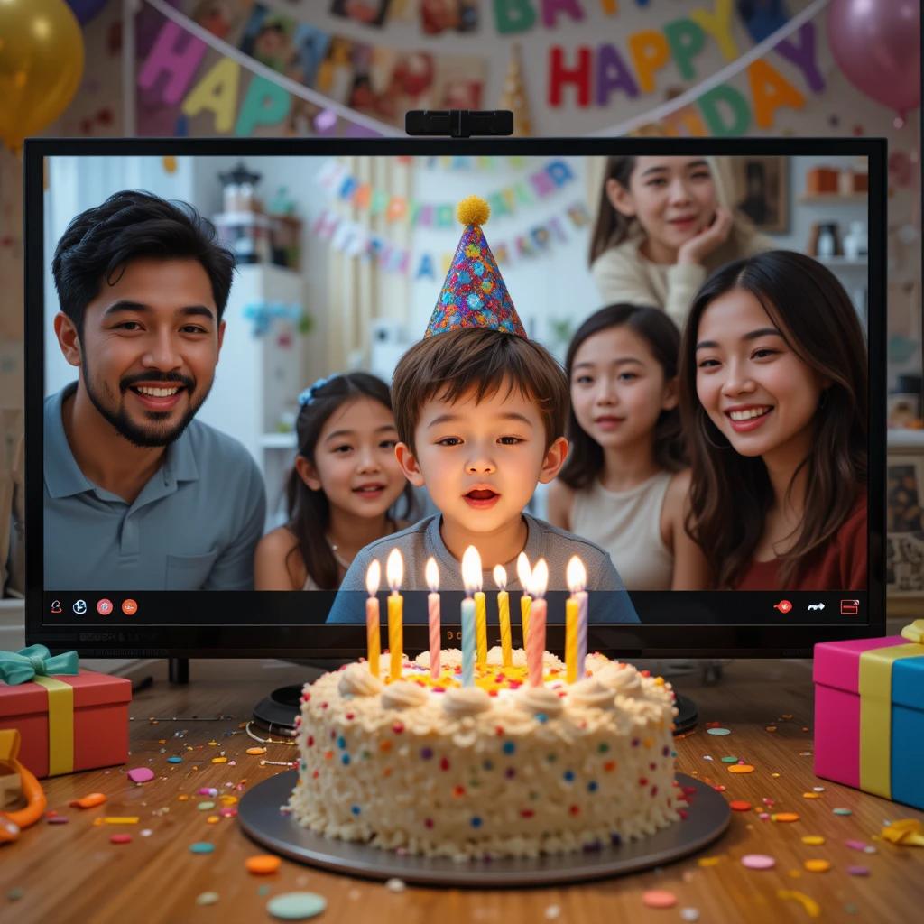 Семья отмечает день рождения ребенка онлайн. Именинник задувает свечи на торте, а гости поют "Happy Birthday" через веб-камеру. На заднем плане видны праздничные украшения и подарки.